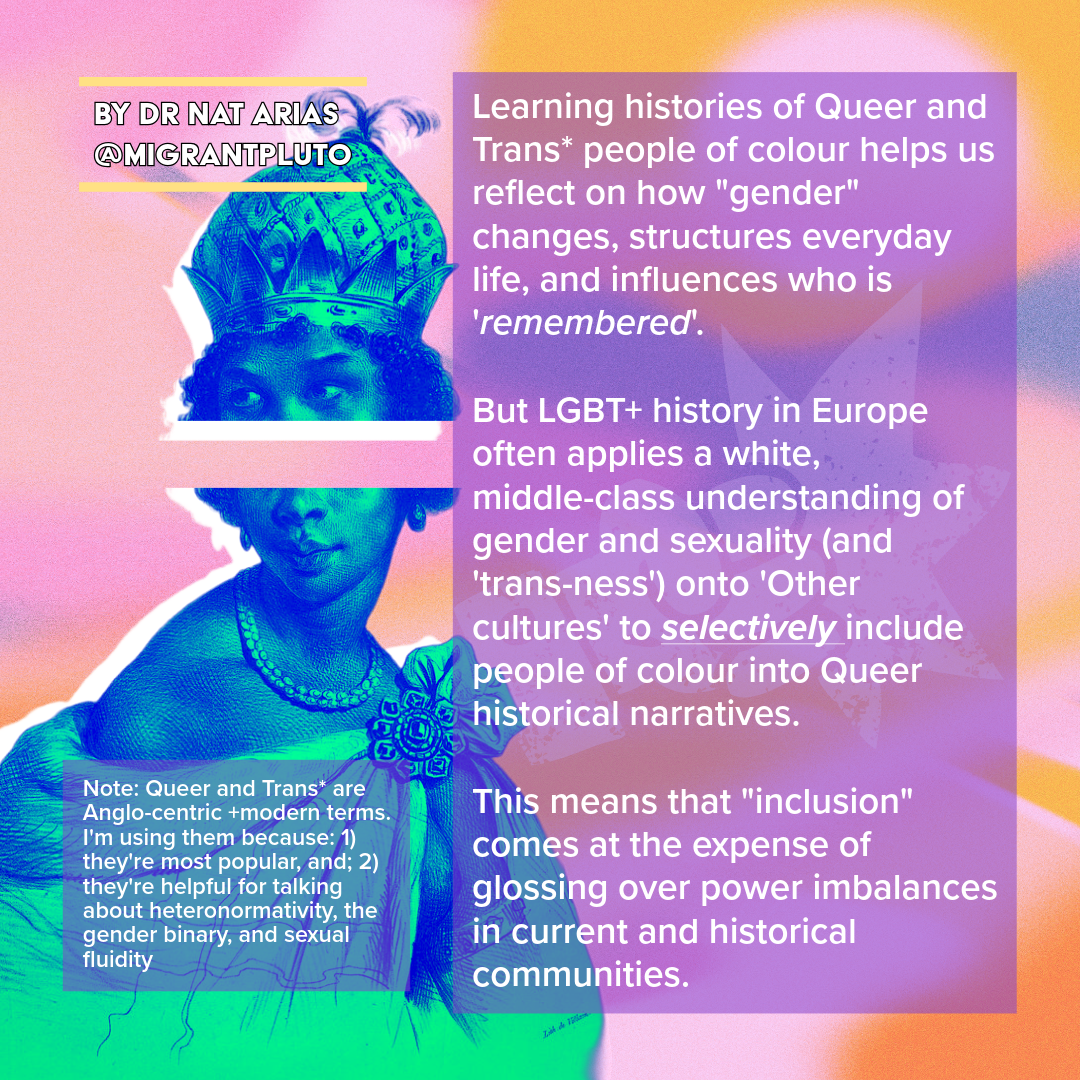 Learning histories of Queer and Trans* people of colour helps us reflect on how “gender” changes, structures everyday life, and influences who is ‘remembered’. But LGBT+ history in Europe often applies a white, middle-class understanding of gender and sexuality (and ‘trans-ness’) onto ‘Other cultures’ to selectively include people of colour into Queer historical narratives. This means that “inclusion” comes at the expense of glossing over power imbalances in current and historical communities.